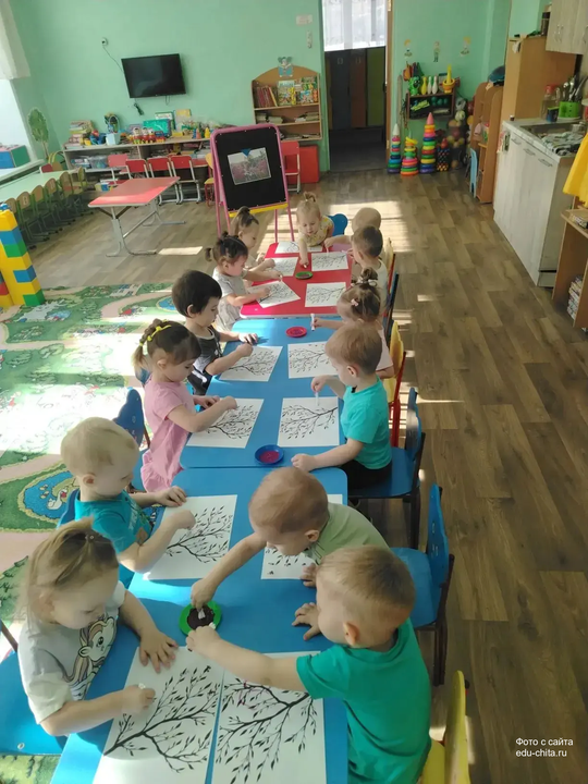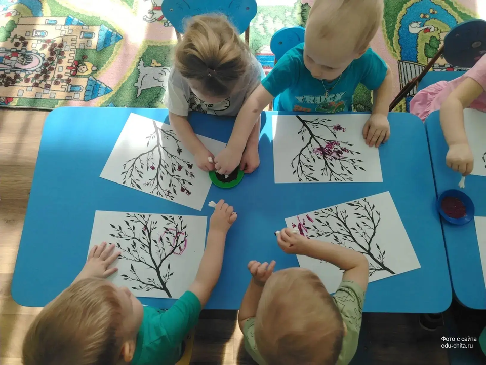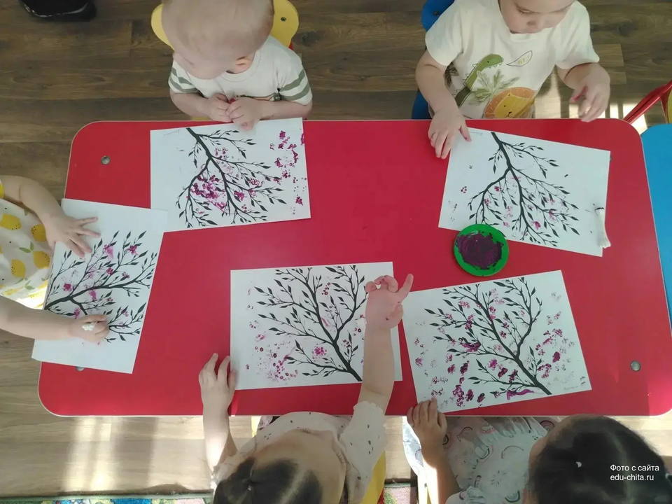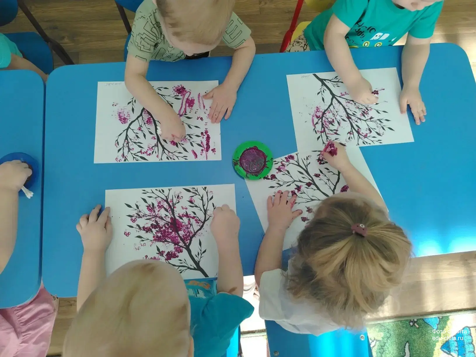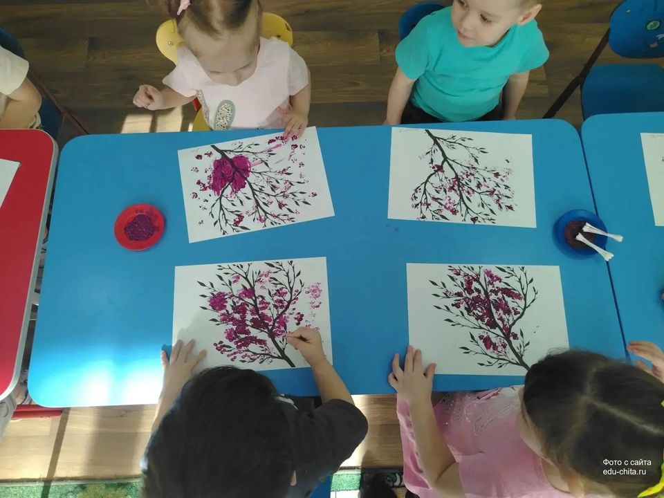 Сегодня воспитанники группы «Смешарики» детского сада №74, используя методику нетрадиционного рисования с применением ватных палочек, выполняли творческое задание, в рамках которого они создавали изображения цветов на веточке багульника.