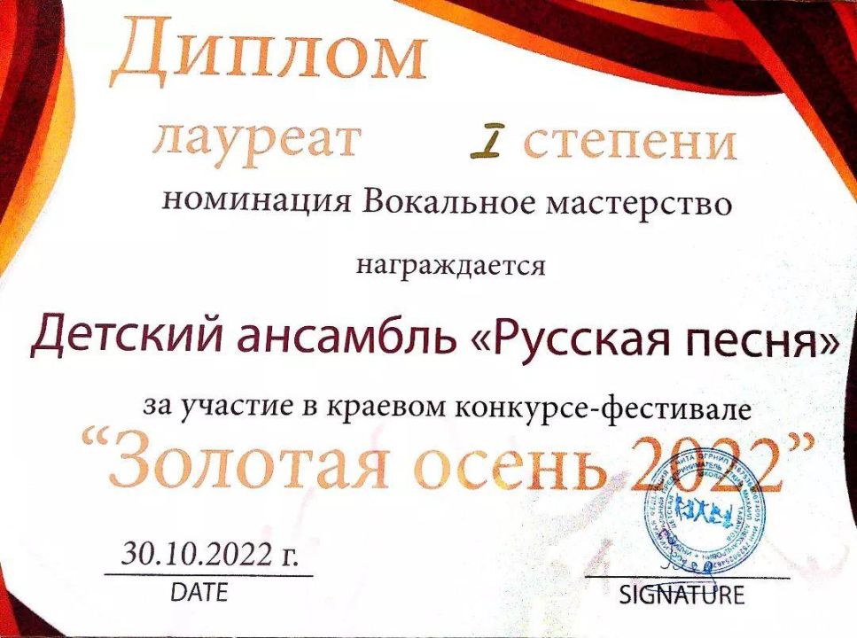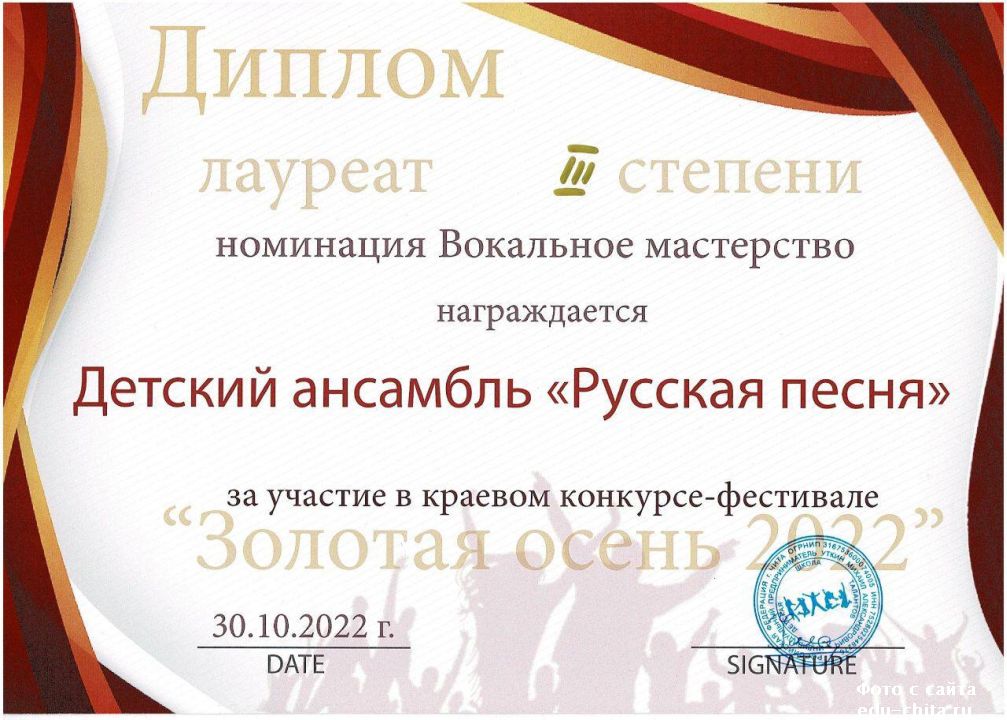 Участие ансамбля «Русская песня» МБУ ДО «Дворца детского(юношеского) творчества г. Читы, в Краевом конкурсе - фестивале «Золотая осень» в номинации «Вокальное искусство», который проходил в Забайкальском государственном университете, где старший состав стал обладателем лауреата I степени, а младший лауреатом III степени. Это достойная оценка труда и преданности профессии педагогов ансамбля, Кислицыной Любовь Семёновны, Москалевой Алёны Владимировны, Пашковой Оксаны Михайловны, которые были отмечены компетентными членами жюри.