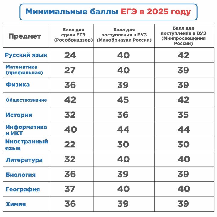 Минимальные баллы ЕГЭ на 2025 год (по стобалльной шкале) смотрите в таблице☝️