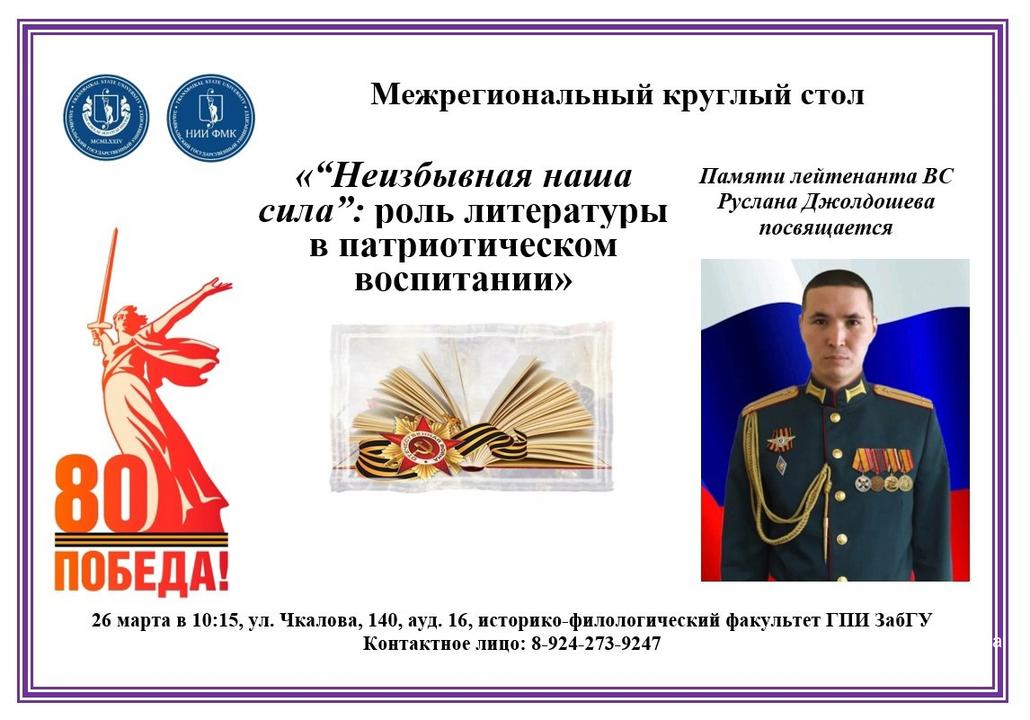 26 марта в 10.15 на историко-филологическом факультете Гуманитарно-педагогического института ЗабГУ (ул. Чкалова, 140, ауд. 16) в год празднования 80-летия Победы состоится межрегиональный круглый стол «Неизбывная наша сила: роль литературы в патриотическом воспитании», посвящённый памяти Руслана Джолдошева, лейтенанта ВС, Ветерана боевых действий, Кавалера ордена Мужества, выпускника Забайкальского государственного университета.
