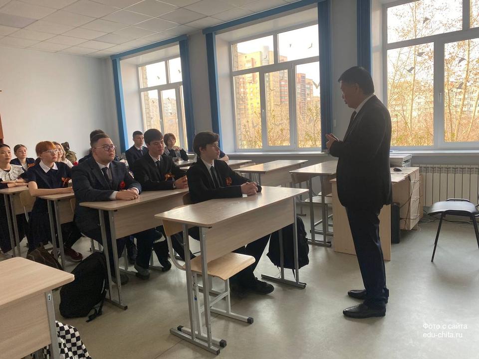 Сегодня, 5 мая, в школе №40 состоялся Урок мужества для учащихся 10 «а» класса. Гостем мероприятия стал председатель Законодательного Собрания Забайкальского края Кон Ен Хва.