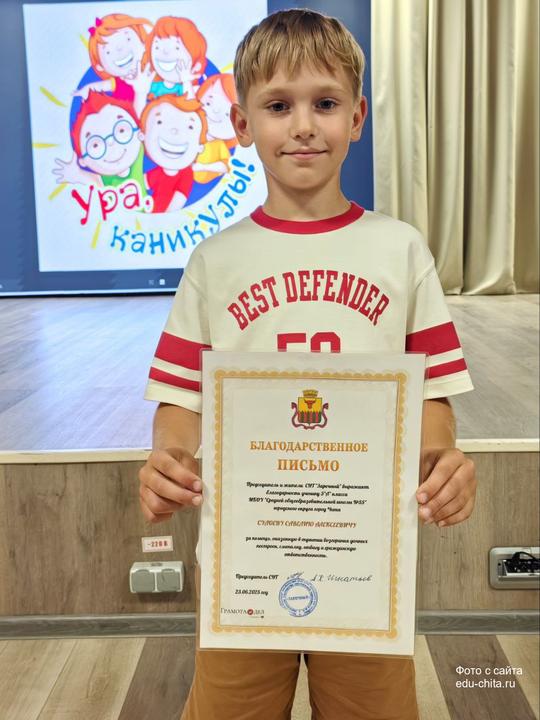 Ученик 3а класса школы №55 Савелий Сулоев получил благодарственное письмо за смелость и быструю реакцию при тушении пожара в СНТ «Заречный».