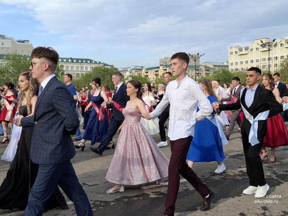Всеобщий школьный выпускной состоялся на главной площади Читы. Празднование открыли те, кто своим трудом и самоотверженностью вложили знания в умы юных забайкальцев — их учителя. Следом на площадь вышли и сами выпускники, станцевали уже традиционный танец полонез.