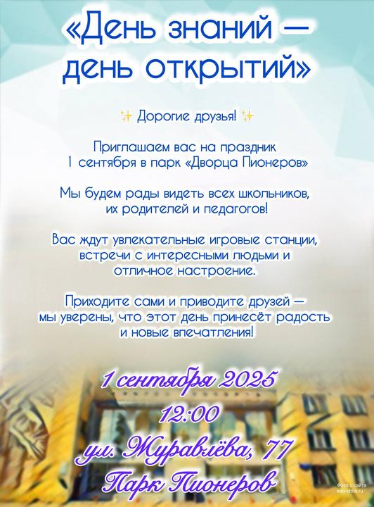 🕰️ Время: 1 сентября в 12:00🔹Место: Парк Пионеров, ул. Журавлёва, 77