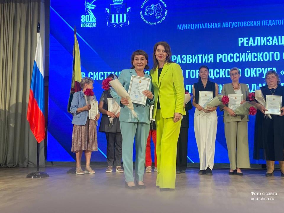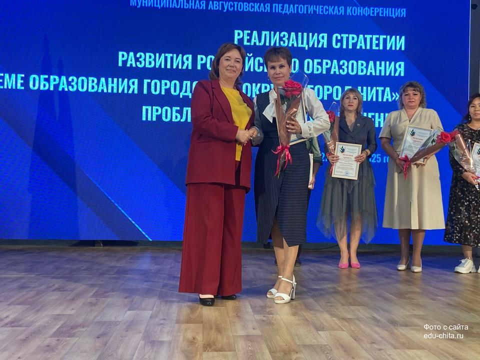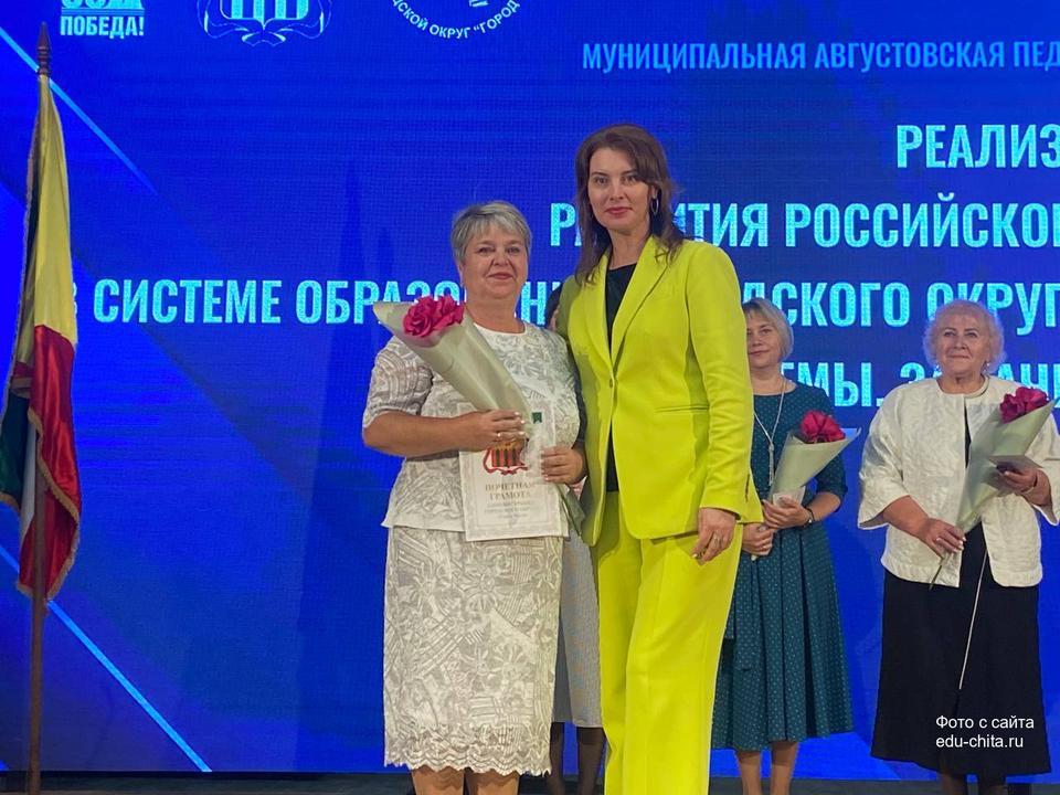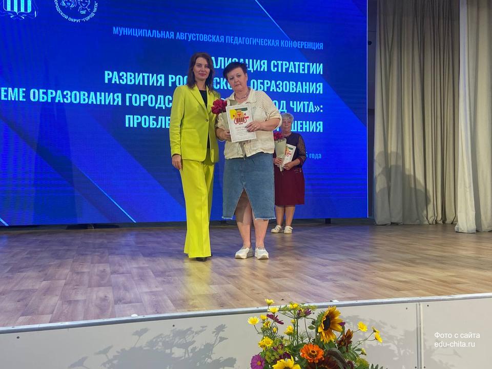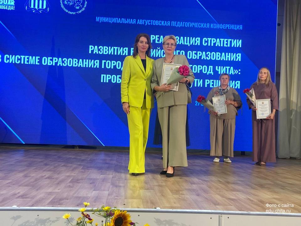 Почетной грамотой администрации Читы за добросовестный труд, профессионализм, ответственность и значительный вклад в создание оптимальных условий для организации образовательного процесса, успешной реализации мероприятий по модернизации школьных систем образования в рамках государственной программы «Развитие образования» награждены:
