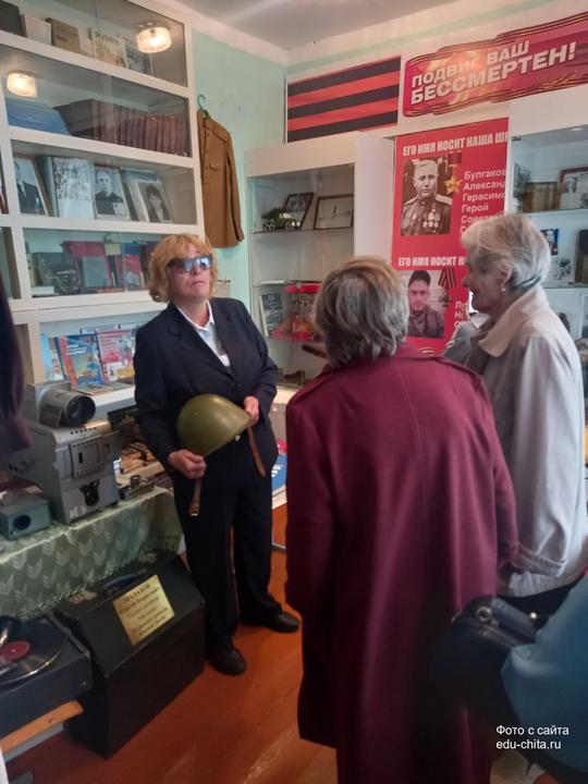 Далее гости посетили школьный музей. Каждый из них внес свой вклад в пополнение музейной коллекции. Виталий Павлович, один из почетных гостей, передал в дар музею целый архив документов, рассказывающих историю его брата, участника войны с Японией. Заведующая библиотекой №20 Ирина Михайловна подарила музею книгу о Чите, связав тем самым историю родного города с историей Великой Победы.