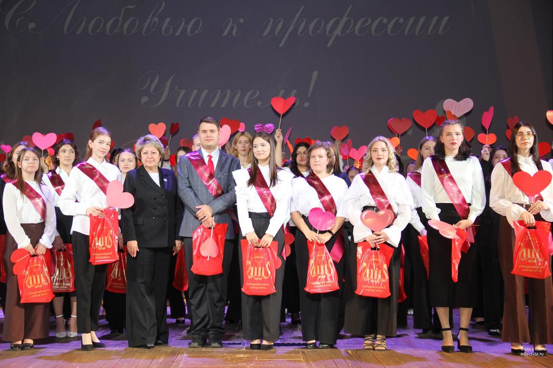 Продолжением торжественной церемонии стало выступление молодых педагогов, которые, держа в руках символические сердца, подчеркнули, что они готовы отдать частичку своей души ученикам. Председатель комитета образования Читы Оксана Кирик поздравила начинающих педагогов с первым профессиональным праздником и вручила им символичные памятные подарки.