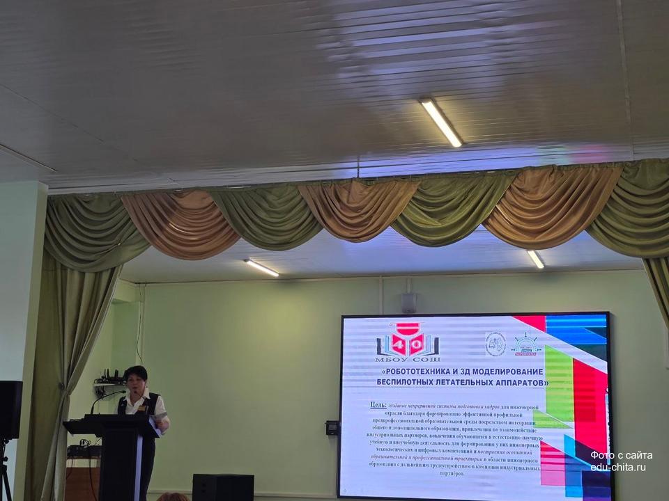 Директор школы №40 Светлана Неверова представила опыт своего образовательного учреждения в организации работы профильного инженерно-технического класса. В ее выступлении также были затронуты вопросы сетевого взаимодействия школы с Забайкальским институтом железнодорожного транспорта и детским садом №87.