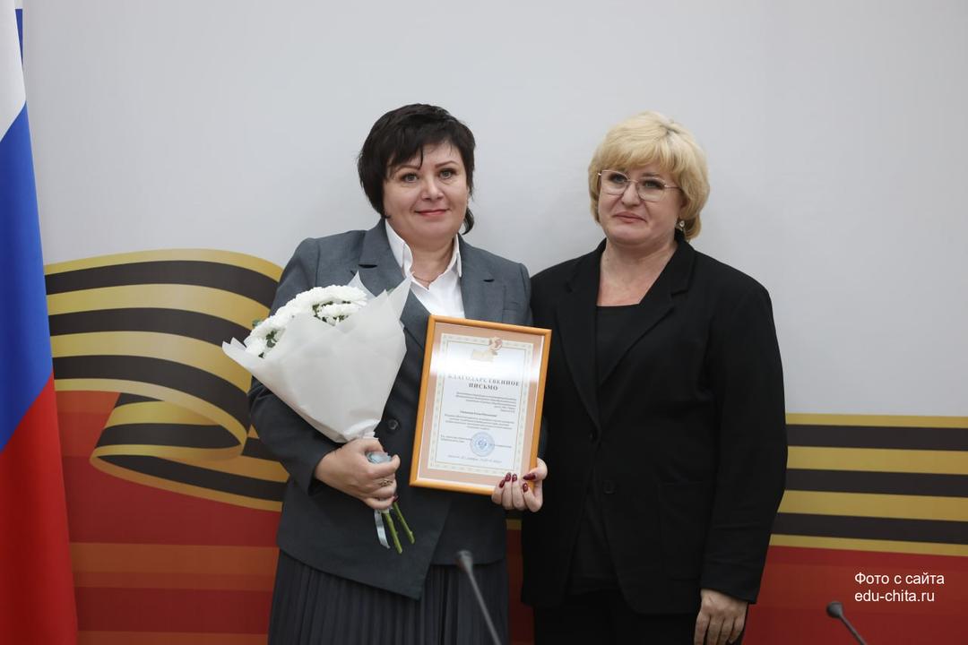 Советник директора по воспитанию школы № 10 имени Героя СССР В. Х. Буйницкого Надежда Пшеничникова и заместитель директора школы № 6 Елена Харина получили благодарственные письма за свой вклад в развитие государственных пабликов. Награды им вручили заместитель председателя правительства края Вячеслав Кулаков и министр образования Забайкалья Марина Секержитская.