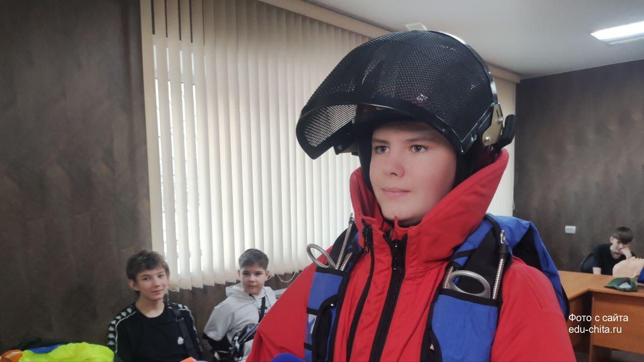 В ходе посещения учебного класса Читинского авиаотделения, ребята с удовольствием примерили на себя костюм пожарного-парашютиста, почувствовали вес парашюта, одели защитный шлем.