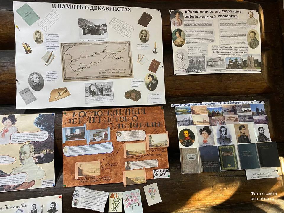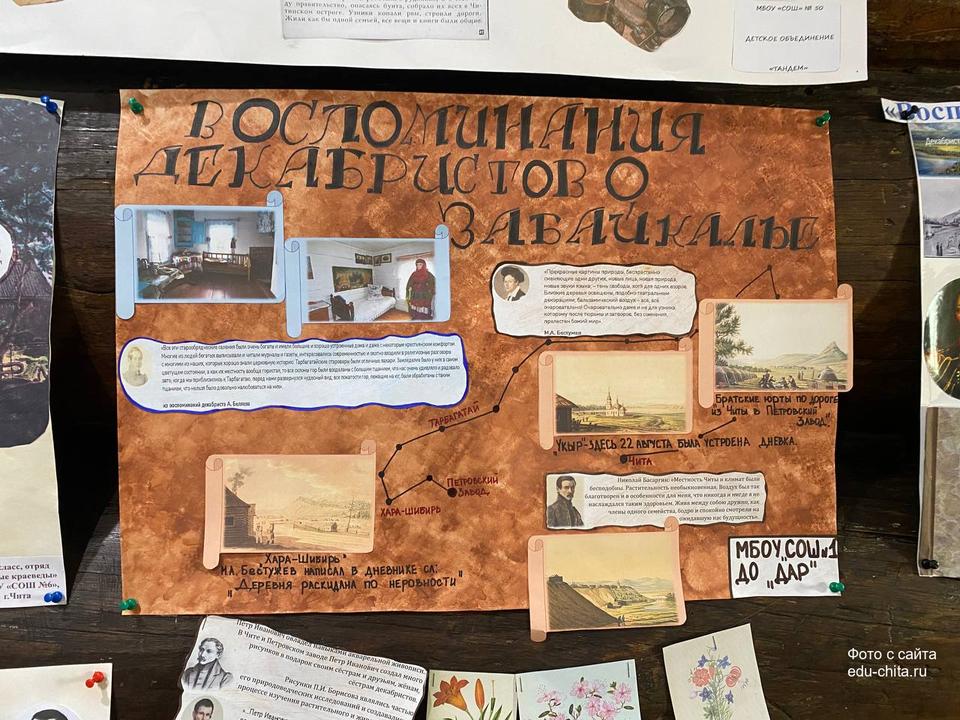 Также ребятам было предложено пройти творческое задание. Они создали художественный коллаж «Воспоминания декабристов о Забайкалье, о Чите». В своих работах ребята использовали фотографии, рисунки, портреты известных декабристов. Основой для творчества послужили дневники и воспоминания таких людей, как А. Розен, Н. Басаргин, М. Бестужев, П. Анненкова, Д. Якушкин, А. Беляев.