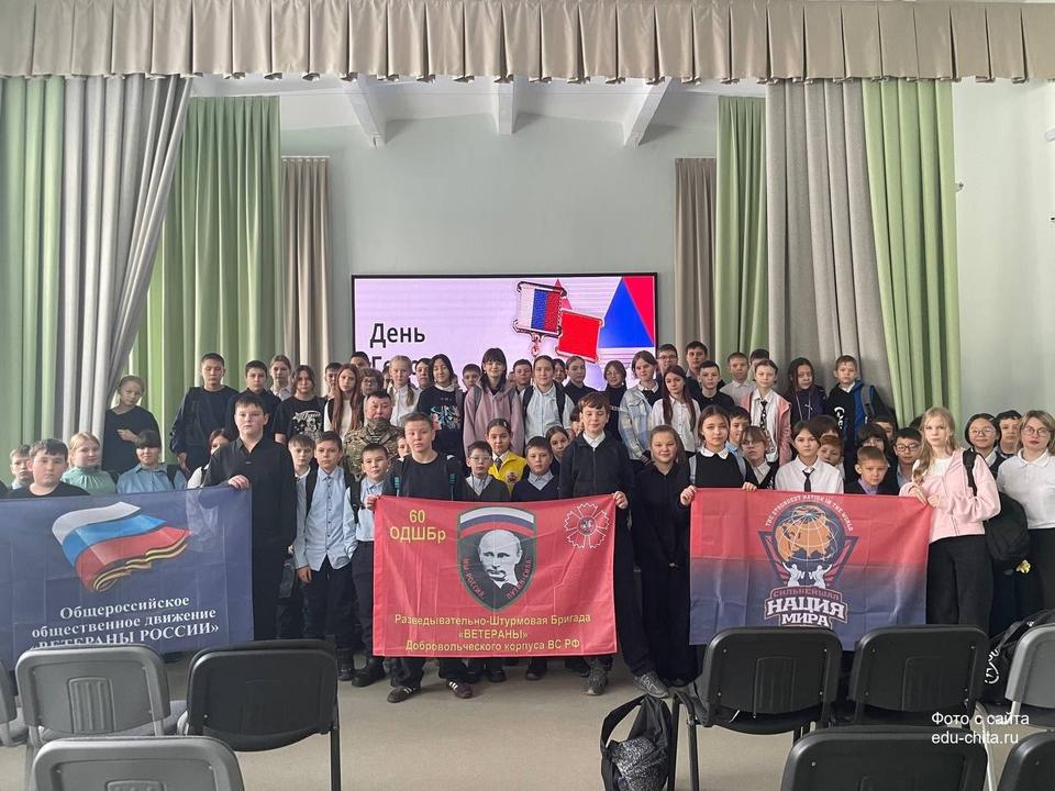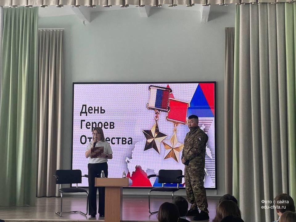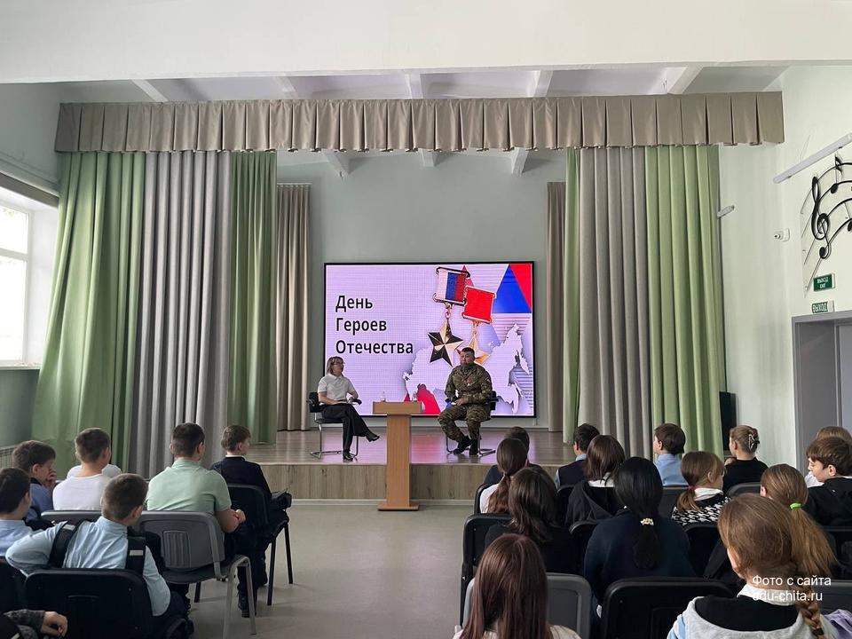 В рамках этого значимого дня в школе №14 состоялась встреча с участником специальной военной операции, председателем ветеранов Забайкальского края Будаевым Дондоком Булатовичем.