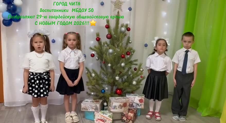 Дети с теплотой поздравили с наступающим Новым 2026 годом бойцов 29-й гвардейской общевойсковой армии. В съемке приняли участие Сукач Денис, Жапова Виктория, Воронина Анастасия и Ерёмина Амилина.