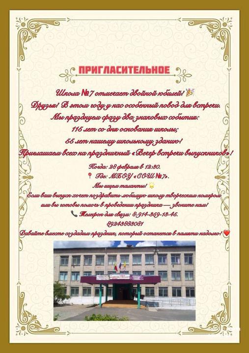 В 2026 году у школы N 7 Черновского района особенный повод для встречи - она будет отмечать два знаковых события: