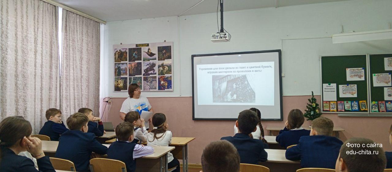 «Новый год в блокадном Ленинграде» - так называлась познавательная беседа для учеников 1-5 классов. В ходе беседы ребята узнали, что, несмотря на голод и холод, блокадный город продолжал жить, для маленьких ленинградцев даже устраивали новогодние утренники, а однажды из Грузии привезли им в подарок мандарины.