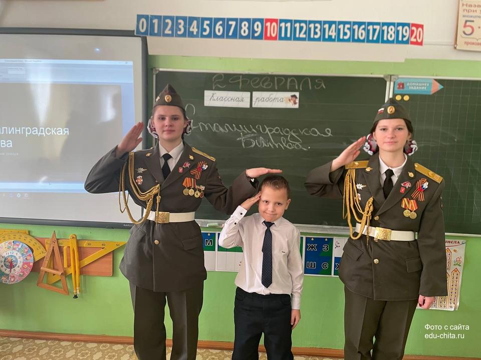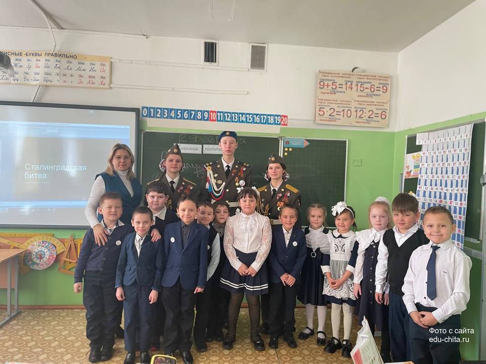 Ребята в парадной форме рассказали о значении битвы и показали видеопрезентацию. На уроках истории старшеклассники узнали ключевые факты сражения и посмотрели видео о мужестве бойцов из Забайкалья, сражавшихся под Сталинградом.