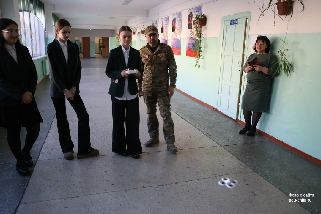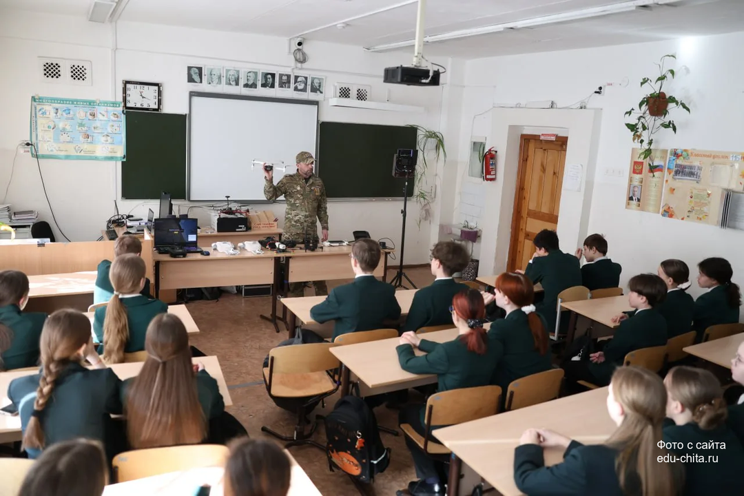 В читинской средней школе №9 накануне Дня защитника Отечества Евгений Попов - забайкальский ветеран СВО, атаман городского казачьего общества «108 станица», входящего в состав Забайкальского казачьего войска, - провел для учеников 7 класса урок по истории появления и развития беспилотной авиации, специфике использовния БПЛА на спецоперации, а также показал, как управлять гражданским дроном.