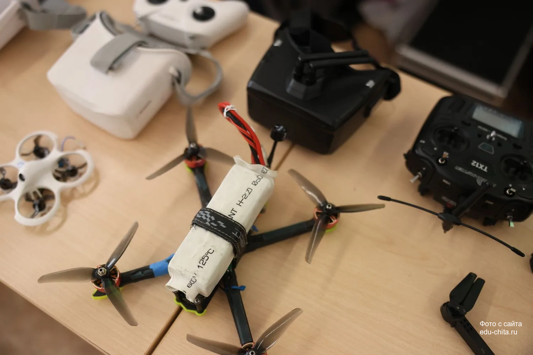 На школьных партах - разные модели беспилотников, в том числе самодельный, рации, элементы управления, FPV-очки - «глаза» оператора БПЛА, через которые сигнал с видеокамеры дрона поступает в режиме реального времени.